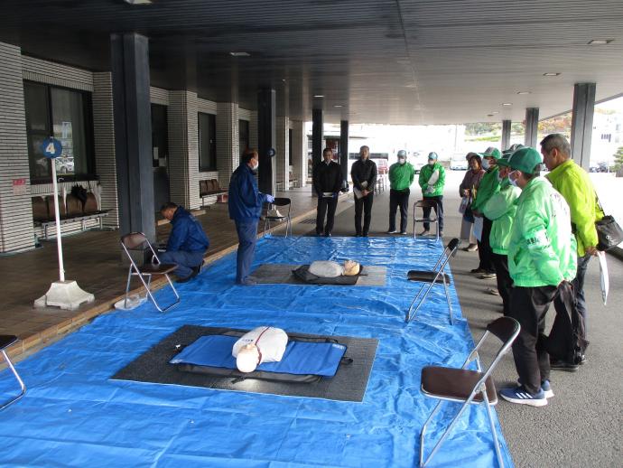 見守り活動時に交通事故現場に遭遇した際の応急救護要領について、心配蘇生法、AEDの活用方法について実践しました。必ず周囲の人の助けを求め、119番通報やAED等の役割を明確に指示することの重要性を学びました。
