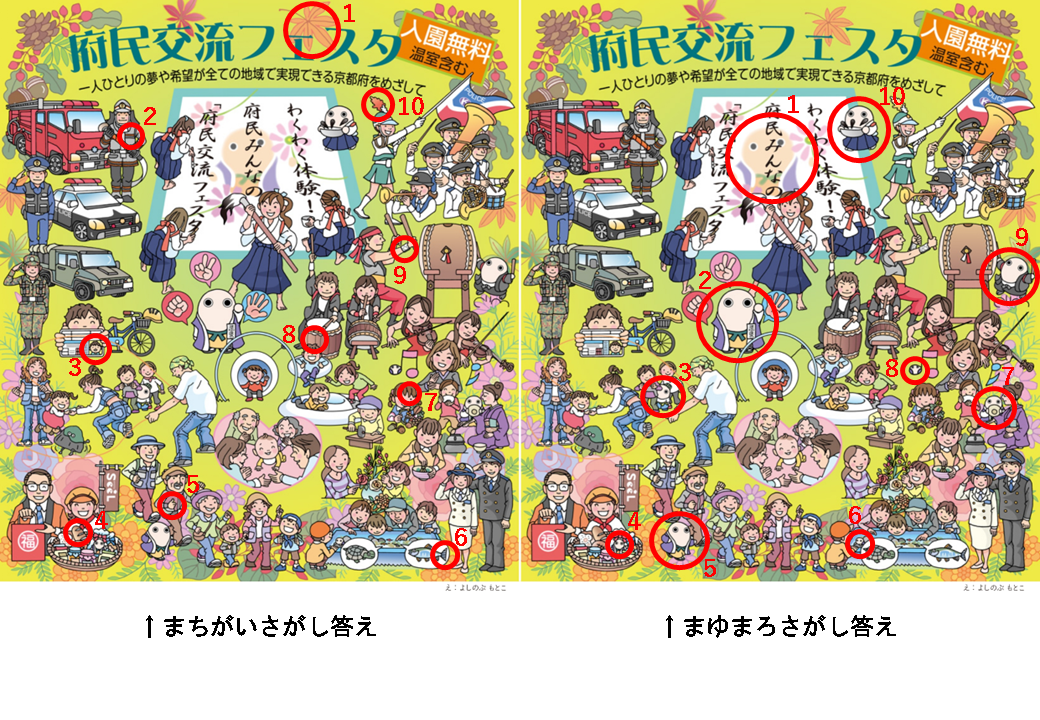 「まちがいさがし」及び「まゆまろさがし」の答えはこちら(PNG:1,421KB)