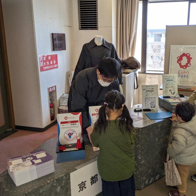 博物館内にスタンプコーナーを設置し、万博関連スタンプ7種類(JR西日本制作:3種、京都府制作:4種)を同時に押すことができるイベントを開催しました。参加者には、7種類のスタンプが押せるオリジナルのスタンプ台紙を無料配布。