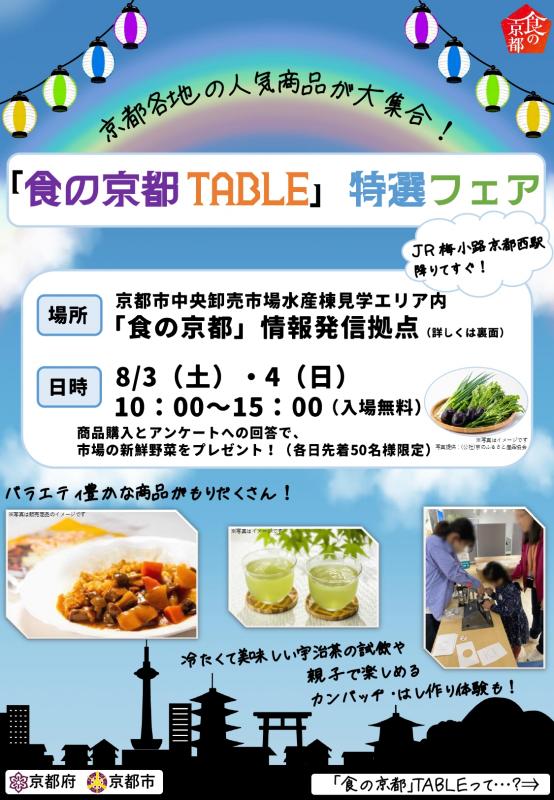 8月3日と4日に「食の京都」情報発信拠点において、各「食の京都TABLE」から集まった人気商品を販売する特選フェアを開催します。(入場無料)