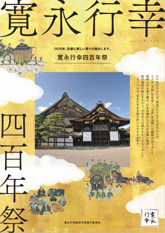 令和8年(2026年)、寛永行幸から400年の節目を迎えるに当たり、行政・経済界・文化芸術団体等によるオール京都の取組として、二条城を中心とする寛永文化ゆかりの地において、寛永行幸の行事を再現するイベントを実施するとともに、寛永年間に花開いた寛永文化を振り返る「寛永行幸四百年祭」を開催します。