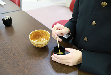 文化祭、中学生1日体験入学でのお茶会に加え、始業式では新任の先生、離任式では離任する先生をお招きしてお茶を差し上げています。