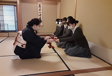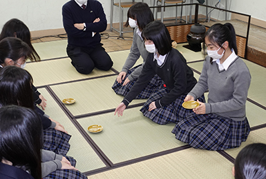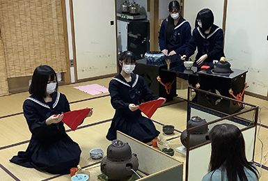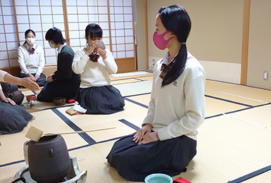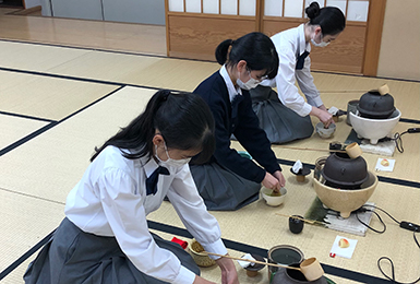 本校は「茶華道部」として毎週金曜日に茶道、月に1回華道を行い、講師の先生より御指導頂いています。