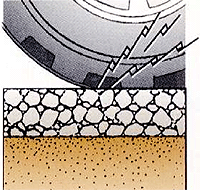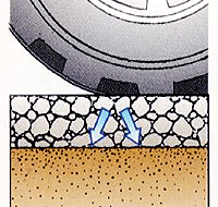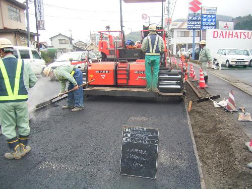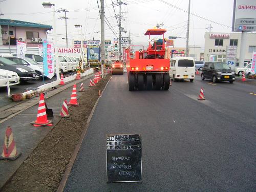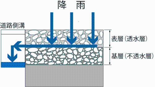 このため、平成15年度より、車道では道路に降った雨を素早く浸透させることにより、降雨時の走行性の向上、交通騒音の低減、走行車両による水はねの低減を目的として、排水性(低騒音)舗装を施工しています。