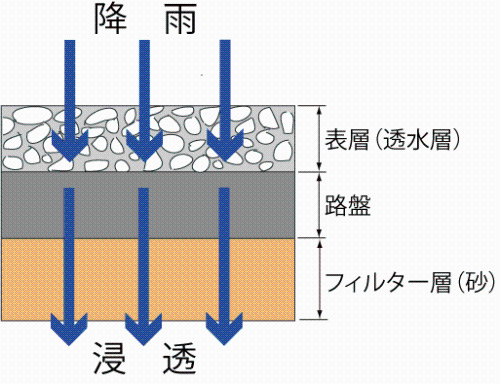 歩道では歩道に降った雨を素早く浸透させることにより、歩行者が快適に歩けるように透水性舗装を施工しています。