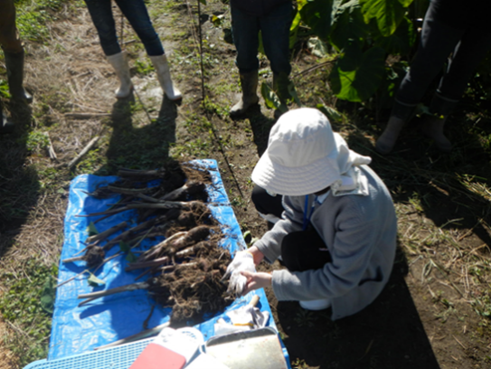 中丹地域では、えびいも生産者の栽培技術習得のため継続的に講習会を開催しています。今回は、収穫や出荷調製、種芋の保存の重要なポイント、出荷規格について、実演を交え説明しました。