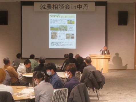 農業分野での多様な人材確保に向け、「農業を始めたい」「農業の仕事に就きたい」という方を対象に、中丹地域の先進的な経営体に質問・相談できる「就農相談会」を開催しました。相談後農場見学に進んだケースもあり、つながりづくりの場となりました。