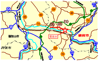 自動車:舞鶴若狭自動車道綾部インターチェンジから府道77号を経て西へ3キロメートル(約10分)