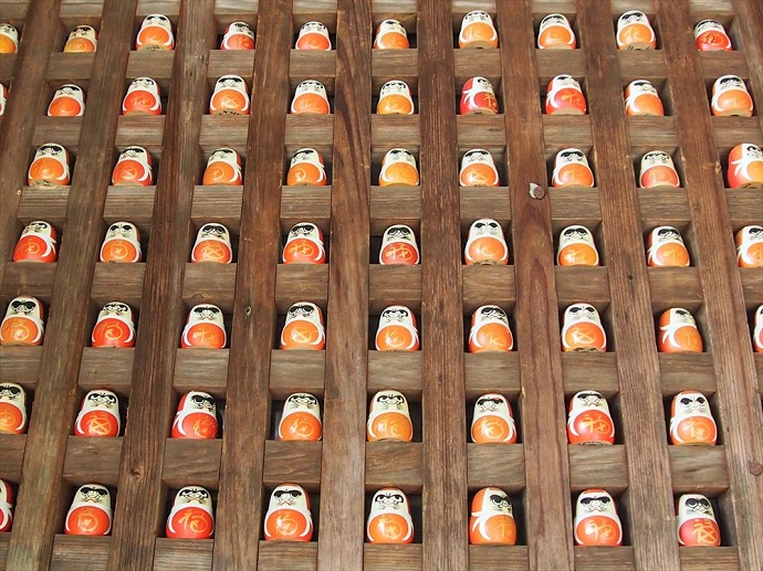 本堂の格子にズラリと並ぶ「だるまみくじ」