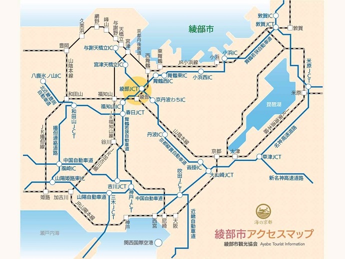 綾部市があるのは京都府の中央部から少し北へ行ったところ。JR山陰線が通っているので京都市内から電車で約1時間、大阪市内からも約2時間で訪れることができますし、舞鶴若狭自動車道と京都縦貫自動車道があるので車でも行きやすく、とっても便利なところにあります。