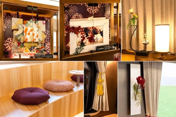 例えば、スーペリアグリーン車の各個室に設えられた飾り棚には美しい「丹後テキスタイルアート」や「越前和紙フラワーアート」(写真:上段左・真ん中)が飾られ、テーブルの上には天平時代から続く「出雲たたら製鉄一輪挿し」(写真:上段右)が。