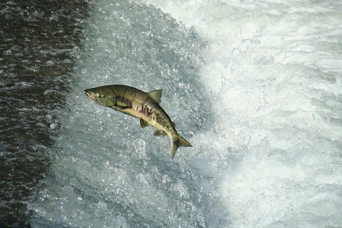 由良川を遡上し、河川の流水を制御する堰(せき)を飛び越えるサケ