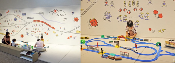 写真は靴を脱ぎ、プラレールで自由に遊べるキッズスペース。雨の日や暑い日、寒い日でも安心してお出かけできる場所があるのは、小さい子どもを持つご家庭にも嬉しいですよね。しかも館内の入場無料エリアには、個室の授乳室を備えたベビールームまで完備されていて、子連れファミリーにとって優しい施設となっています。