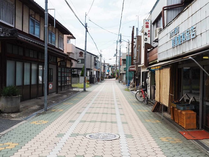 御霊神社近くのアオイ通り商店街の道路は、「鉄道のまち」らしく線路を模したカラー舗装がさています。