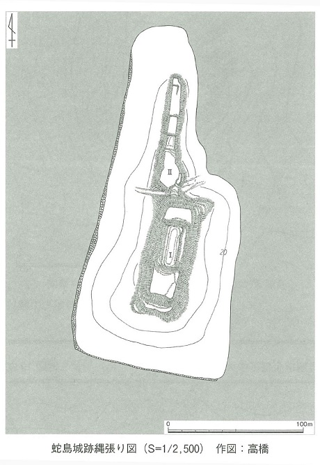 中世の時代、蛇島には山城が築かれた。海水の堀はないが、いわば水運を押さえる「海城」。「京都府中世城館跡調査報告書」(参考文献・舞鶴の山城)によると、島の南側には見張り台などを建てるため山の斜面を造成してつくった平坦地の曲輪(くるわ)が残り、三段の主郭部から成る「蛇島城」があった。