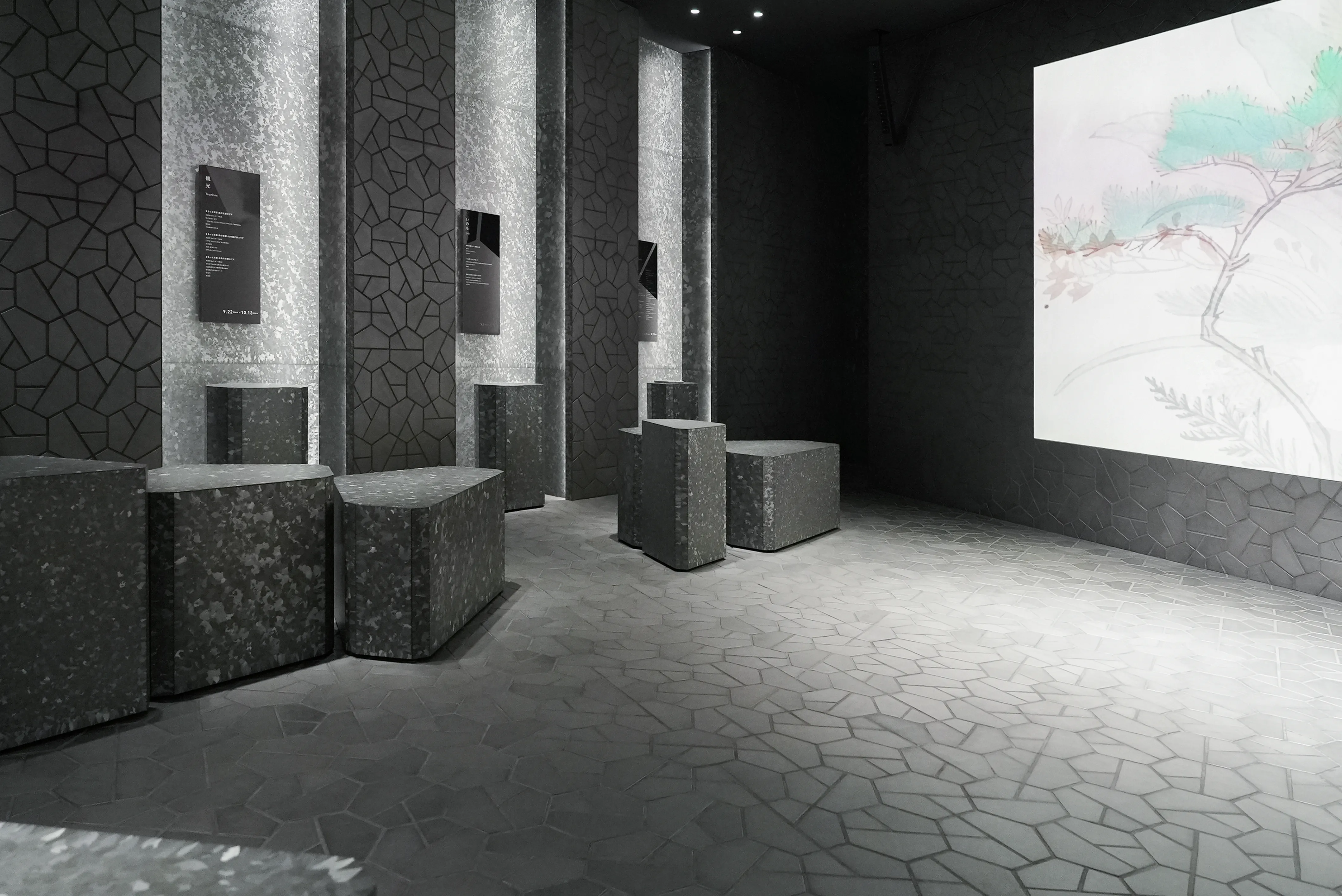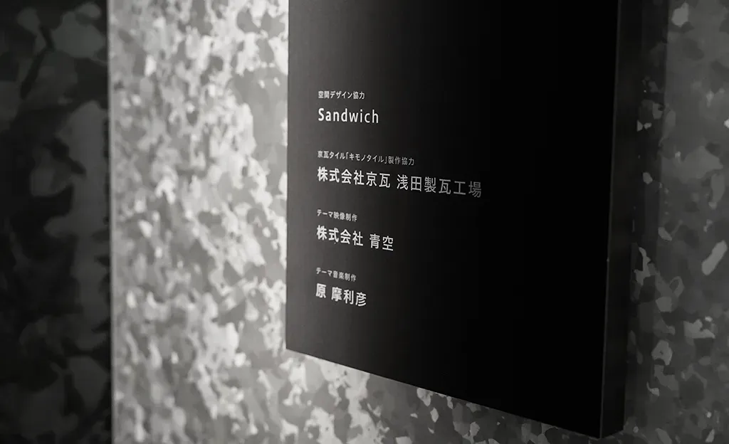 空間デザインは京都縁のアーティストたちが手がける。壁から床までをオリジナルの京瓦「キモノタイル」で覆うことでミニマルかつ静謐な空間を演出。ノンバ―バールな映像と音響が空間と一体となることで、来場者がじっくりと京都の未来と過去に向き合えるような体験を創出する。入り口の扉が開くと、目に飛び込んでくるのは大きなスクリーン。都市文化と自然、伝統と革新など、異なる営みが共存している京都府の魅力が、映像として映し出される。