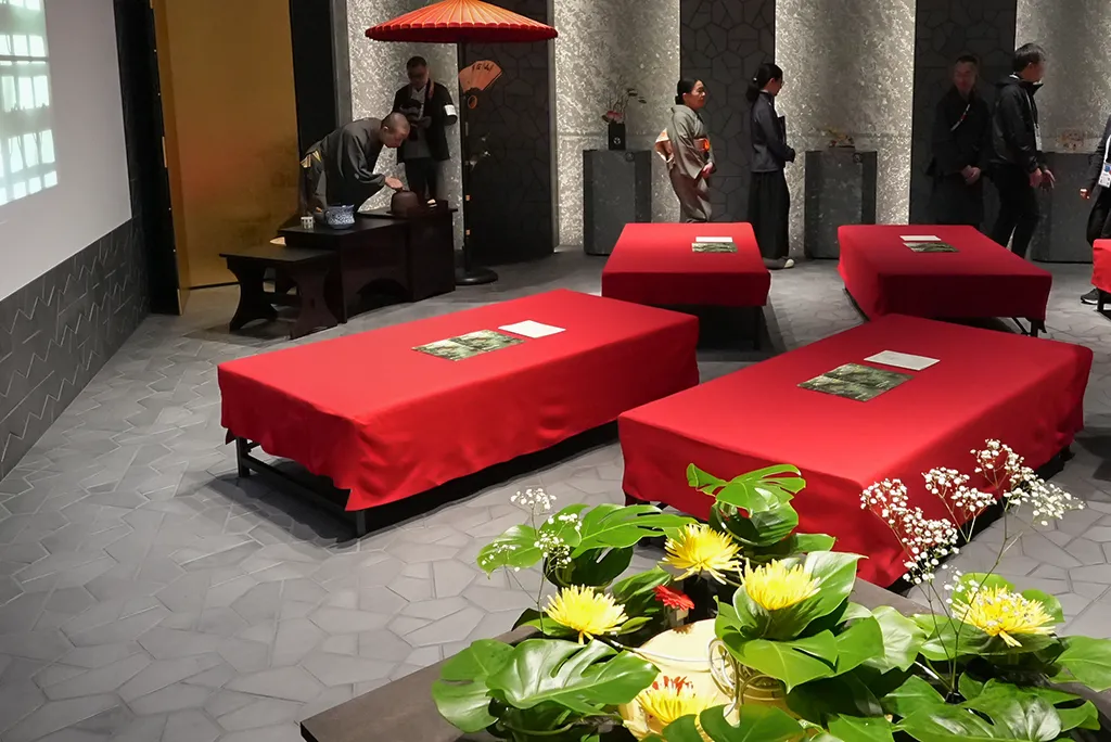 京都ゾーンのオープニングを華やかに彩るのは、表千家不審菴(おもてせんけふしんあん)・表千家同門会京都支部による抹茶の振る舞いと、華道家元 池坊(いけのぼう)による生け花の展示です。