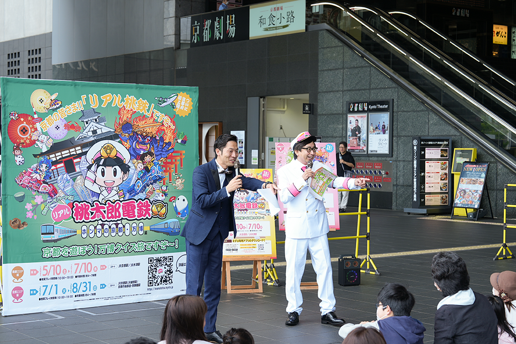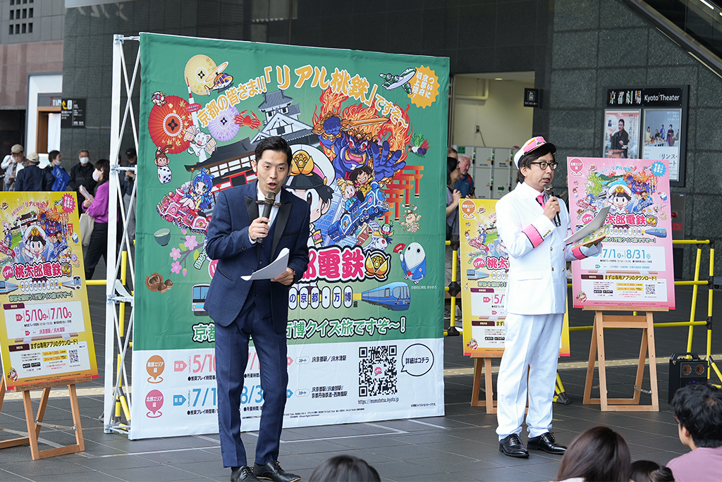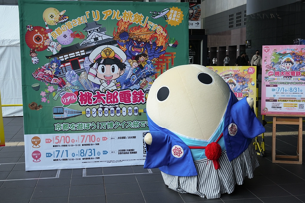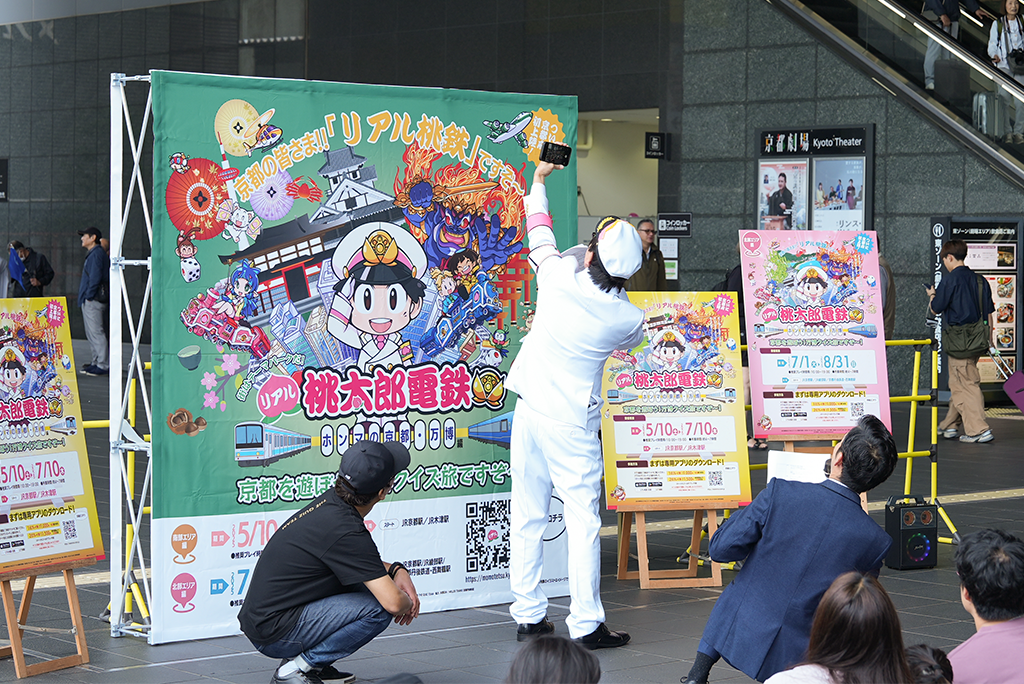 大人気ゲーム「桃太郎電鉄」とコラボした特別企画「リアル桃太郎電鉄~ホンマの京都・万博編~」が、2025年5月10日からスタート!第一弾となる「南部エリア編」の開始を記念して、京都駅前広場で出発式が行われました。