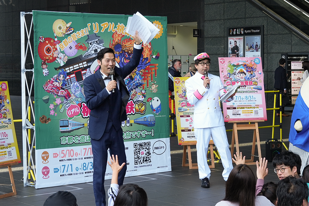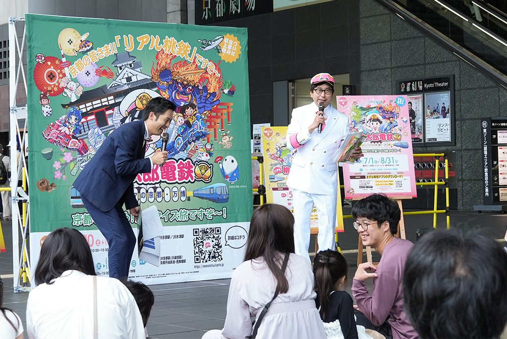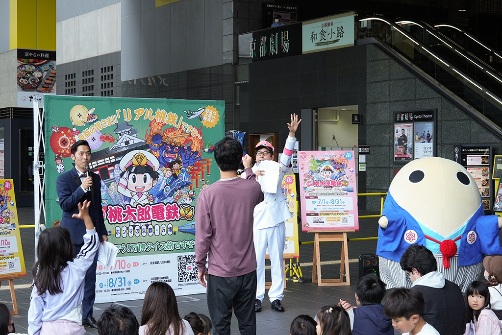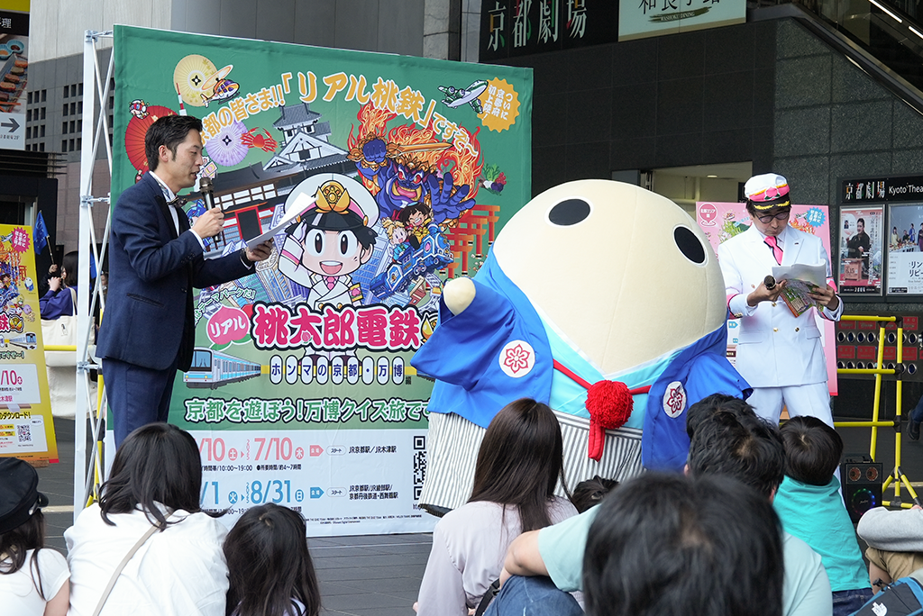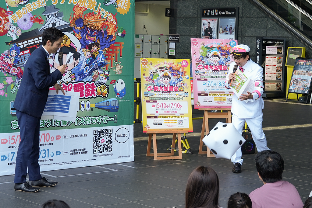 大人気ゲーム「桃太郎電鉄」とコラボした特別企画「リアル桃太郎電鉄~ホンマの京都・万博編~」が、2025年5月10日からスタート!第一弾となる「南部エリア編」の開始を記念して、京都駅前広場で出発式が行われました。