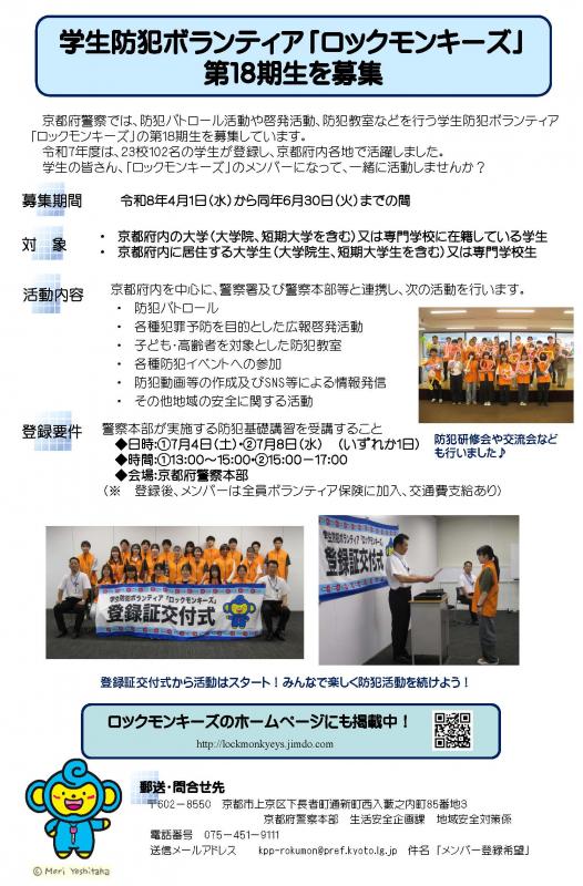 トップページ > 安全な暮らし > 防犯対策(防犯ニュース、防犯メール登録) > 学生防犯ボランティア【ロックモンキーズ】の募集