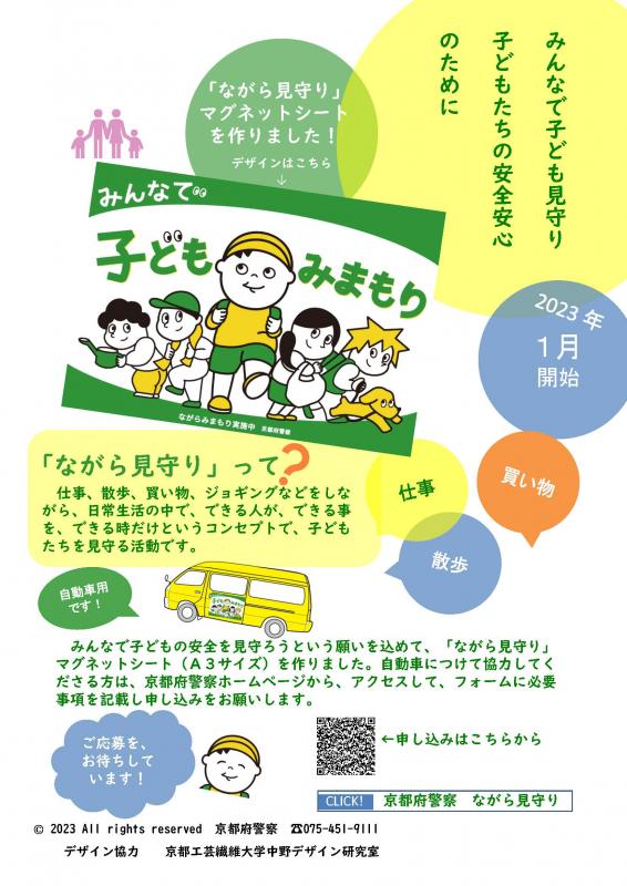 みんなで子どもの安全を見守ろうという願いを込めて、「ながら見守り」マグネットシート(A3サイズ)を作りました。自動車につけて協力してくださる方は、下のリンクのフォームに必要事項を記載し、申し込みをお願いします。