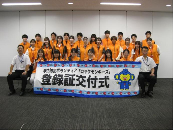 京都府警察では「学生の街・京都」の特性を活かし、自主防犯活動に参加を希望する大学生を対象に「学生防犯ボランティア(愛称:ロックモンキーズ)」登録制度を創設し、21大学2専門学校102名(令和7年度)の学生が登録して活動しています。今後の「ロックモンキーズ」の活動に対するご協力、応援をお願いします!