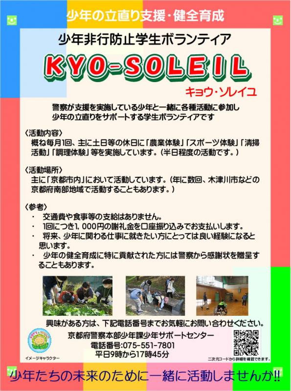 京都府警察では、この活動に参加していただくボランティアとして、平成26年3月に少年非行防止学生ボランティア「KYO-SOLEIL」(キョウ ソレイユ)を立ち上げました。