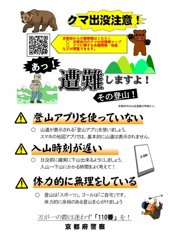 連日のように全国各地でクマによる人的被害が報道されていますが、京都府内においても、これまで目撃がなかった地域においてクマの目撃情報が寄せられていますので、山に登る際には情報収集に努めてください。