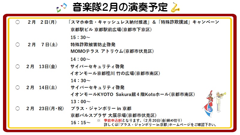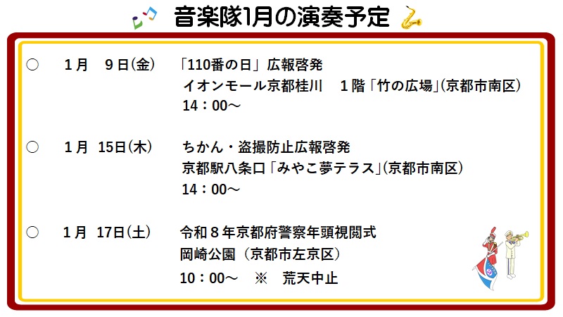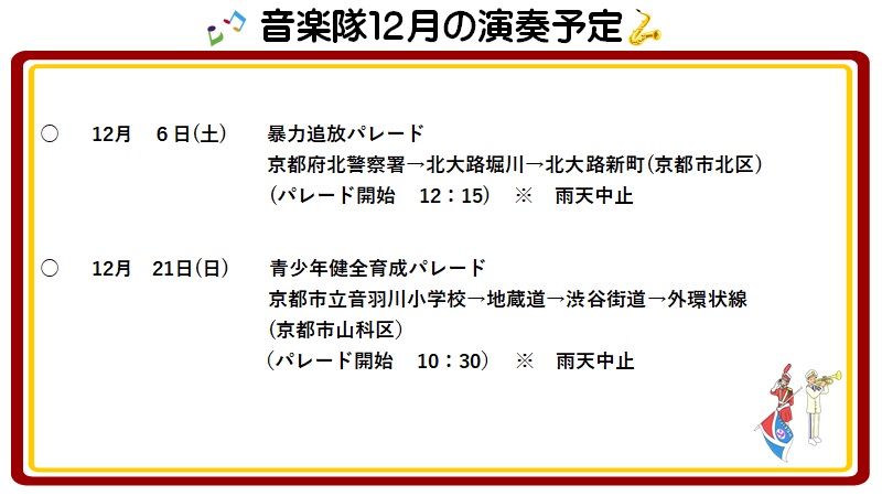 京都府内の各警察署が開催する交通安全や地域安全などの行事における演奏・演技のほか、自治体主催の行事における式典演奏など、幅広い活動を通じて、府民の皆さんと警察とを結ぶ「音の架け橋」として、音楽パトロールを府内一円で繰り広げています。
