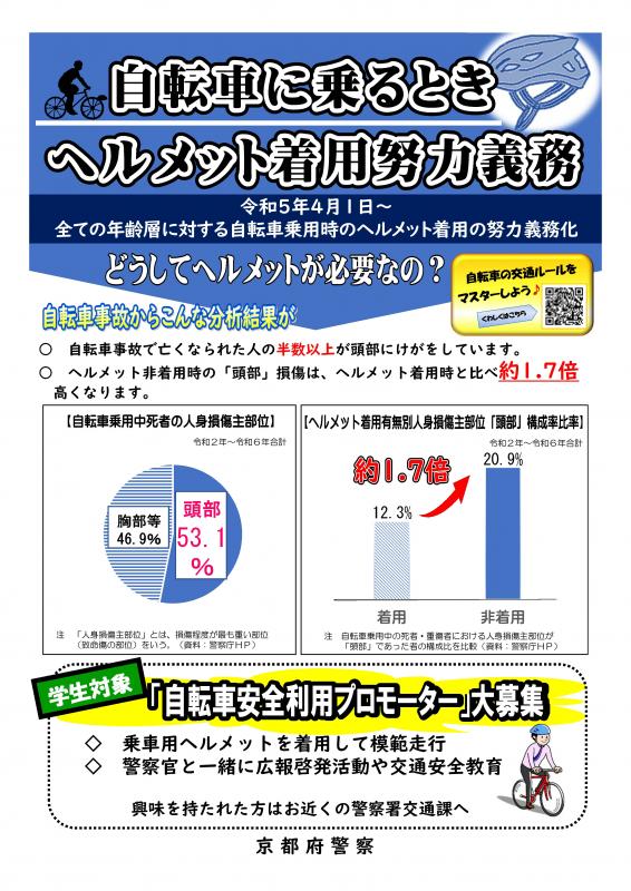 改正道路交通法の施行により、令和5年4月1日から全ての自転車利用者のヘルメット着用が努力義務化されました。