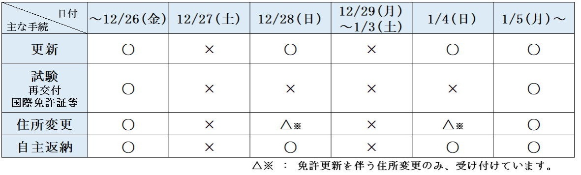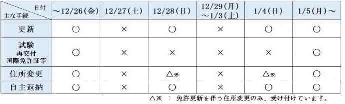 年内の更新業務は12月28日(日)まで(警察署は12月26日(金)まで)、新年の更新業務は1月4日(日)から(警察署は1月5日(月)から)受け付けています。