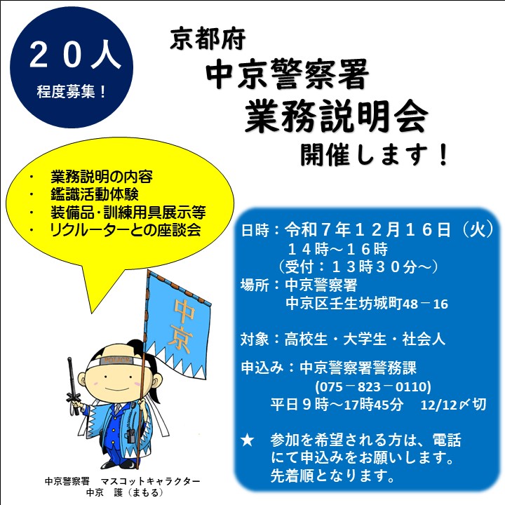 トップページ > 京都府警察の紹介 > 京都府警察採用情報 > 業務説明会・体験イベント > 中京警察署 業務説明会(令和7年12月16日(火))