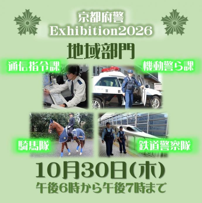 トップページ > 京都府警察の紹介 > 京都府警察採用情報 > 業務説明会・体験イベント > 京都府警Exhibition2026を開催します(第2弾開催日令和7年10月30日(木))