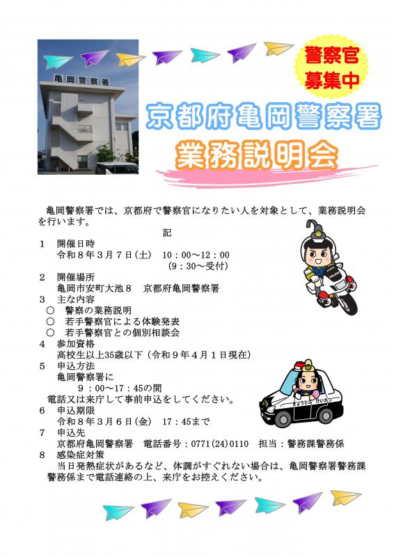 トップページ > 京都府警察の紹介 > 京都府警察採用情報 > 業務説明会・体験イベント > 亀岡警察署 業務説明会(令和8年3月7日(土))