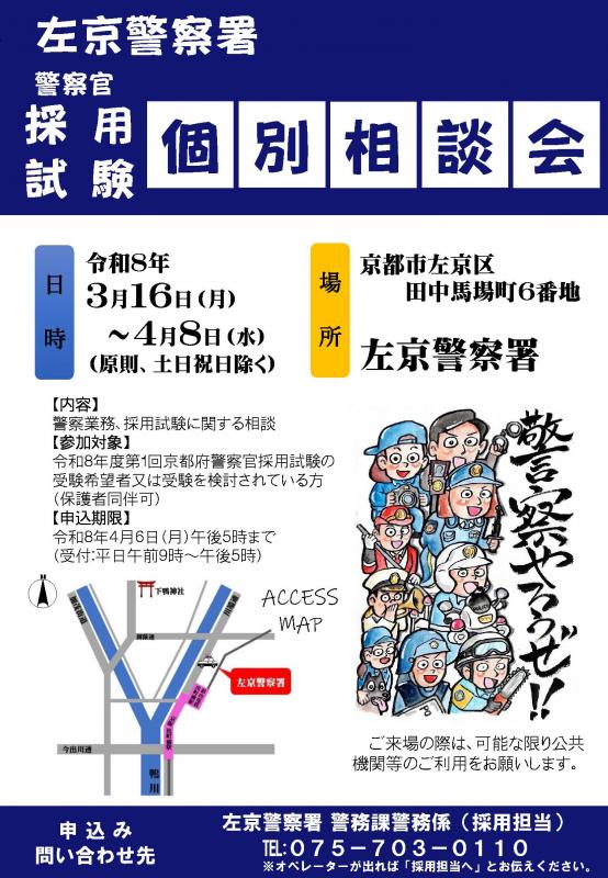 左京警察署では、京都府警察官採用試験に関する個別相談会を実施します。警察官採用試験の受験をご希望、又はご検討されている方は、チラシ(PDF:355KB)をご確認の上、お気軽にお申込ください。