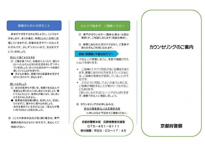 京都府警察では、犯罪被害にあわれた方やそのご家族等に対し、カウンセラー(臨床心理士・公認心理師)によるカウンセリング(無料・要予約)を行っています。