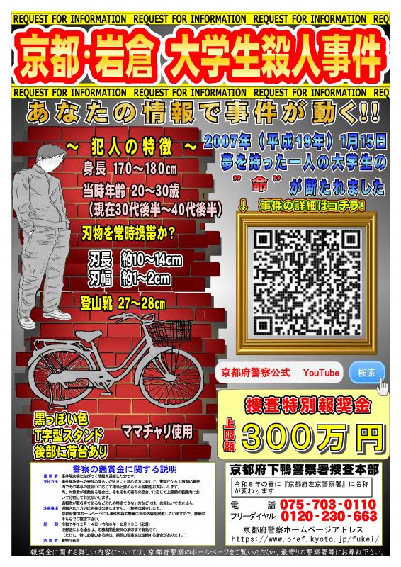 トップページ > 安全な暮らし > 情報提供のお願い > 未解決事件に関する情報をお寄せください > 左京区岩倉幡枝町における大学生殺人事件