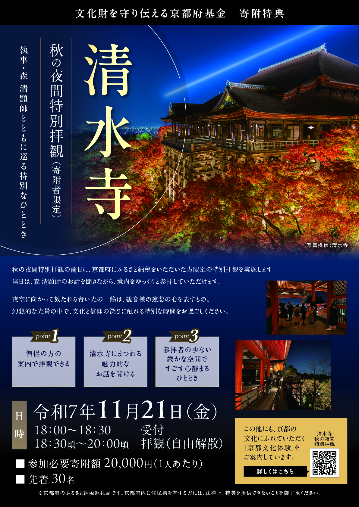 当日は、清水寺の執事 森清顕氏の 解説を聞きながら、 夜の静けさに包まれた境内を ゆっくりと巡っていただけます。 |