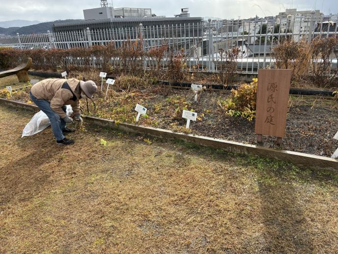 「源氏の庭」ではオミナエシが見頃です。大原野産の希少な苗を譲り受け、この夏開花しました。キキョウやナデシコと同じ秋の七草です。暑さに強い植物ですが、雨のない日が続いており、水やりが欠かせません。