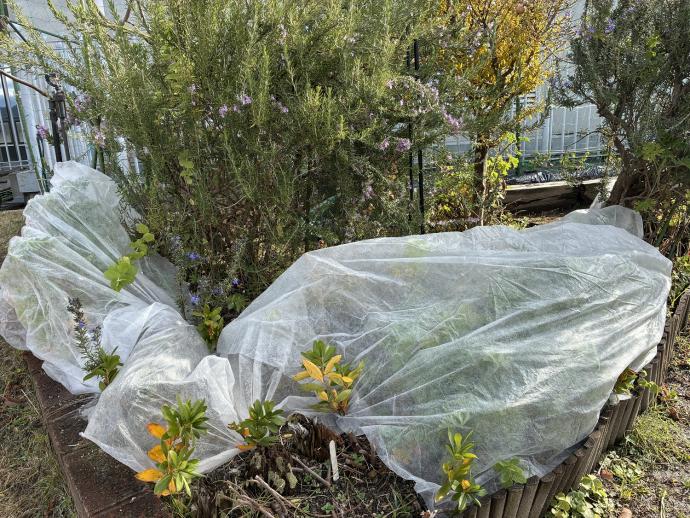 12月とは思えないような暖かい日が続いたあと、ようやく、冬の冷たい風の中、年末の作業を終えることができました。花壇の枯れた草木をすべて伐採し、地上部は閑散としましたが、奥の花壇では、スイセンとローズマリーが元気に咲いています。寒さに弱いハーブは小さく切り詰め、霜から守るために不織布をかけました。