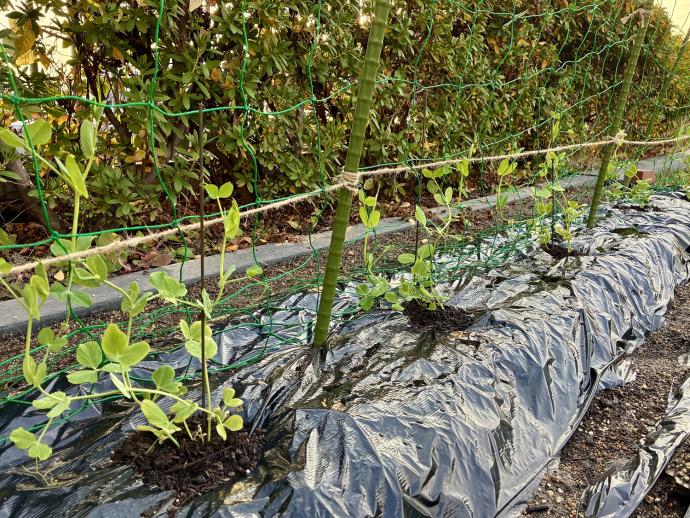 菜園では、スナップエンドウのつるが巻き付けるように支柱を立てていただきました。マルチングを行ったので雪が降っても根元が凍りつかず、無事に冬を越せそうです。