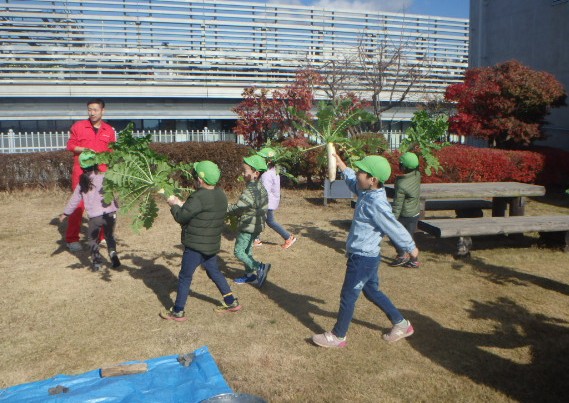晴れた気持ちのよい午前中、それぞれのグループに分かれて、京緑隊の皆さんにお手伝いいただきながら、一人ひとりが大根を収穫しました。収穫した大根を並べて、形や大きさを友達と比べ合う姿が楽しそうでした。