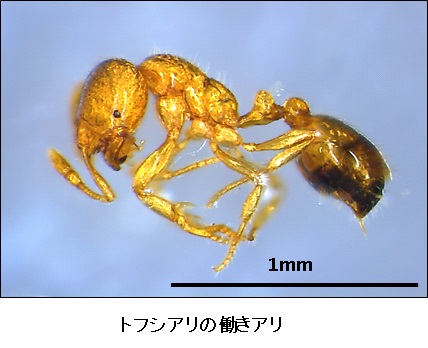 本種は体長が1.5mm程度と非常に小さいので、ヒアリ・アカカミアリと見分けることができます。本種はヒアリ・アカカミアリと同じトフシアリ属に属するため、形態はよく似ていますが、主に地中で生活しているため、見かけることは少ないかもしれません。体色も黄色で、ヒアリ・アカカミアリとは異っています。