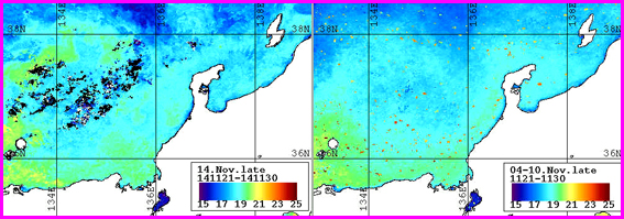2014年11月下旬における京都府沿岸海域の表面水温(左図)は、17~19度台で推移したとみられます。近年の同時期(右図)と同程度でした。