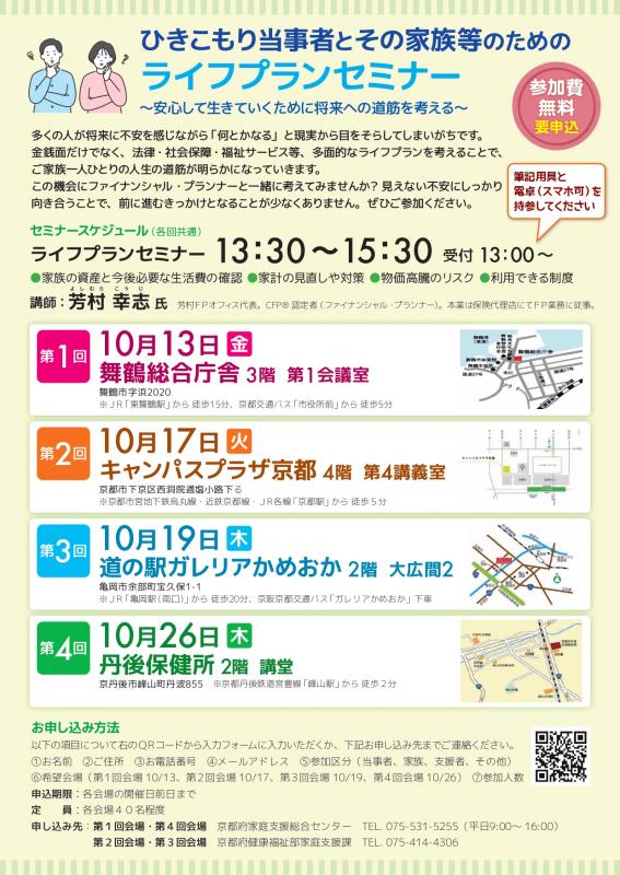 京都府では、ひきこもり状態にある当事者とそのご家族に、ライフプラン(将来設計)について学んでいただく無料のセミナーを府内4箇所で開催します。この機会にご家族が安心して生きていくため、ファインシャル・プランナーと一緒に将来への道筋について考えてみませんか?