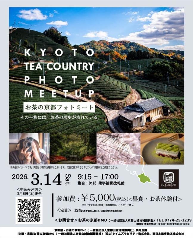 京都府、お茶の京都DMO、森の京都DMOでは、観光周遊カーシェアリング事業※の利用促進や地域の魅力発信を目的に、観光周遊カーシェアステーション(JR宇治駅・JR亀岡駅)を発着地として、「お茶の京都」・「森の京都」エリアを周遊するフォトツアーを開催します.