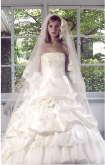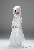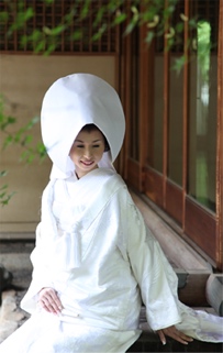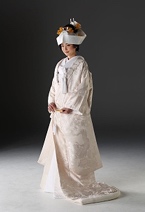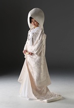 打掛(着物を着た上から打ち掛けて羽織る着物)、掛下(打掛の下に着る着物)、帯、小物、下着など、すべてを白で統一した花嫁のための和装です。日本では、神前式の時は白無垢を着るのが一般的です。白は古来、「太陽の色」とされた神聖な色で、花嫁の清らかさや心の美しさを象徴します。