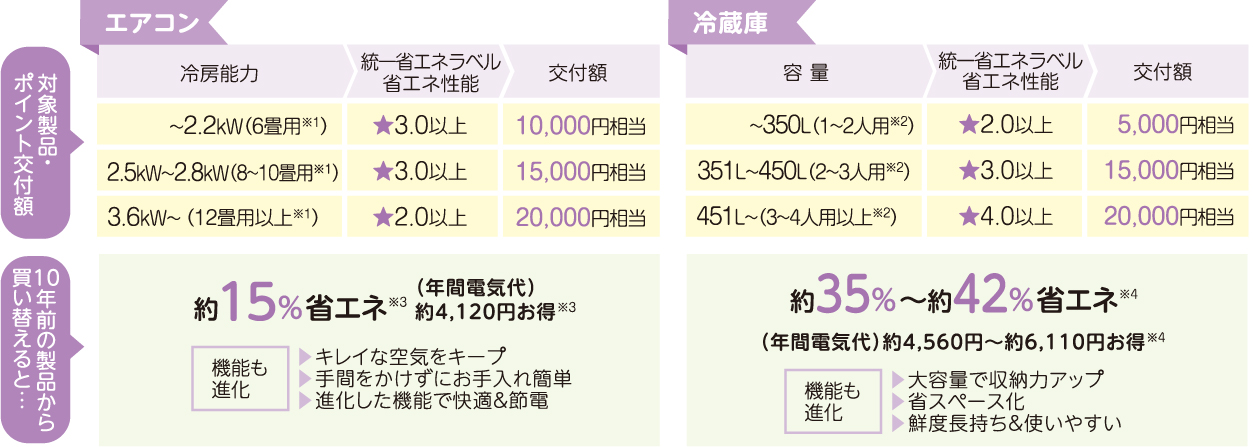 温室効果ガス排出量削減に向け、府民の皆さんの脱炭素型ライフスタイルへの転換を推進するため、府では、一定の省エネ性能を有するエアコンまたは冷蔵庫を購入した方に、最大2万円相当のスーパーなどで使える電子マネー(府内利用限定)や牛肉などの府内産品を還元するキャンペーンを実施しています。