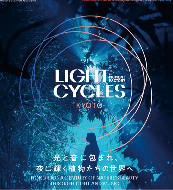 植物たちがきらめく光に包まれ、冬の夜に安らぎと温もりを添え、この季節ならではの幻想的な光景で皆さまをお迎えします。LIGHT CYCLES KYOTOの新エリア「なからぎの森」も、ウィンター仕様でお楽しみいただけます。