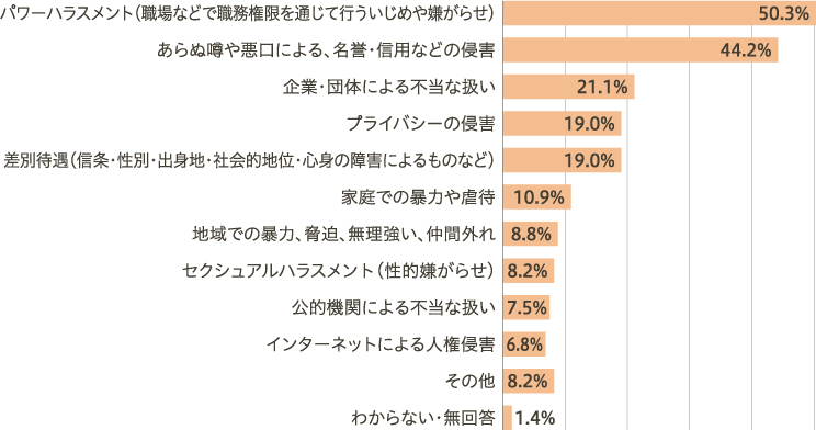 職場や学校、地域、家庭など、生活の中のさまざまな場面で、いろいろな形の人権侵害が起きています。